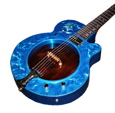 This guitar comes standard with a 22 fret Rosewood, 25-inch scale neck with 3 on a  side tuners.